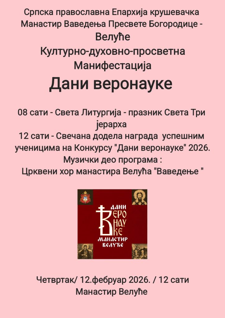 Манифестација “ Дани веронауке” одржава се у манастиру Велућу на дан Света Три Јерарха 12. фебруара.